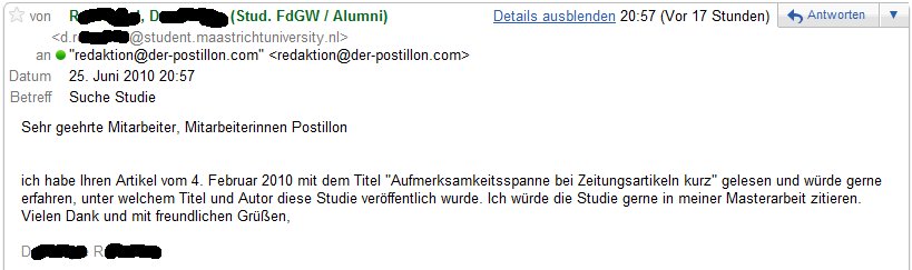 Die Satirezeitung “Der Postillon” schrieb einen Artikel über eine Studie, dass die Aufmerksamkeit beim Lesen von Zeitungsartikeln rapide abnimmt. Jetzt meldet die Zeitung, dass sie eine Anfrage eines Studenten bekommen haben, der für seine Masterarbeit nach der Quelle fragt. Der Chefredakteur meint: Mit einer etwas längeren Aufmerksamkeitsspanne wäre R. vielleicht gar bis zu den beiden … „Die Satire wird von der Wirklichkeit eingeholt“ weiterlesen